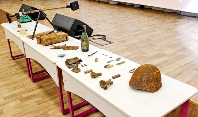 В актовом зале школы была организована выставка артефактов с места поисковых работ на Зайцевой горе, к которым учащаяся молодежь проявила неподдельный интерес.